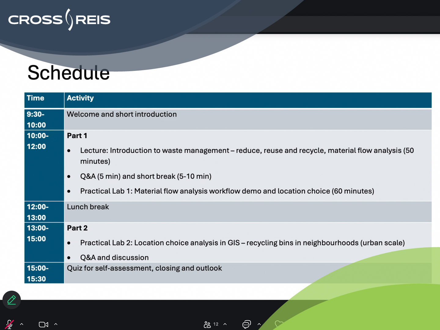 The curriculum aims to equip participants with practical skills for applying spatial analytical and modelling approaches in circular economy and waste management projects. Through a combination of lectures, demonstrations, hands-on labs, and self-assessment, participants learn to distinguish between digital methods, analyze and interpret spatial data, and create visualizations that effectively support decision-making in real community contexts.