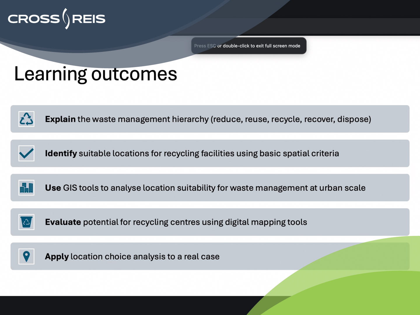 By the end of the module, participants strengthened their capacity to apply digital mapping tools, evaluate waste flows, and use spatial decision-support techniques that are increasingly essential for effective waste management planning. This training represents another step in the CROSS-REIS mission to enhance research excellence and empower widening institutions with tools that support regenerative and sustainable urban development.